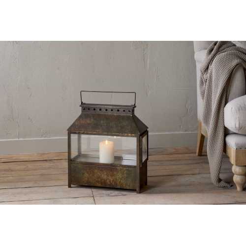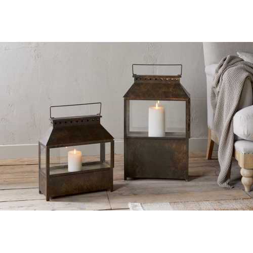 Part of our wide lantern collection, this piece features a solid lower section that gives it a grounded, substantial feel, ideal for floor display. Finished in a warm brown patina, it has an earthy, natural character that complements a variety of interior styles. Its versatile design makes it easy to style across a range of interiors. Available in two sizes.