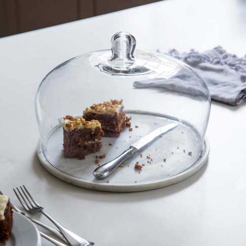 The Garden Trading Cake Dome is a sleek and stylish cake dome perfect for storing your sponges, cupcakes, loaves and pastries. The low gleaming Glass dome of the Cake Dome sits on a contrasting marbled raw Slate base for a decorative designer cake dome that will suit numerous domestic and commercial kitchen design schemes. The off-white marble base of the Cake Dome is incredibly mesmerising with the material being both heavy and decorative with the natural white and grey flecks complimenting the clear glass dome lid. Part of the Garden Trading Kitchen Foodhall collection, Garden Trading have taken inspiration from grand London delis with their stretches of marble counters and array of fresh bread, cakes and produce on display. Whether used daily or for special occasions, the exquisite Cake Dome can sit neatly on a kitchen worktop or dining table for all to enjoy. As the Marble has been left raw and untreated, greasy foods may mark the surface if left for a long duration so we recommend using a base plate. Visit our dedicated Garden Trading brand page for the brand's full home and garden collection.