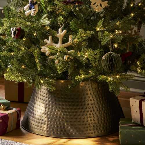 Introducing the stunning Garden Trading Hinksey Hammered Tree Skirt in Antique Brass, a masterpiece that beautifully enhances your festive decor while offering functionality. Crafted from high-quality brass, this exquisite two-part design not only serves as a striking base for your Christmas tree but also elevates the overall aesthetic of your indoor space. The hammered texture adds a touch of elegance, making it a perfect fit for both traditional and contemporary settings.