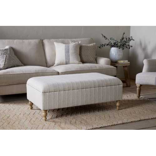 A practical and stylish addition to any living space, this storage ottoman is upholstered in a soft cotton and linen blend with a subtle stripe. Its generous interior is perfect for stowing away blankets, books, or everyday items, while the cushioned top doubles as a comfortable footrest or extra seat. Finished with elegant wooden legs, it-s a versatile piece that brings both form and function to your home.