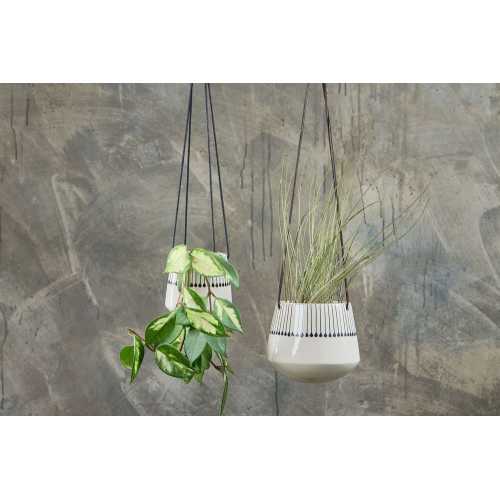 The Nkuku Matamba Matchsticks Hanging Planter features a delicate black matchstick pattern on a white glaze. This modern round planter is perfect for displaying succulents and plants. The Nkuku Matamba Matchsticks Hanging Planter is a natural product and variations may occur. This hanging planter has a leather tie with an opening width of 65cm.