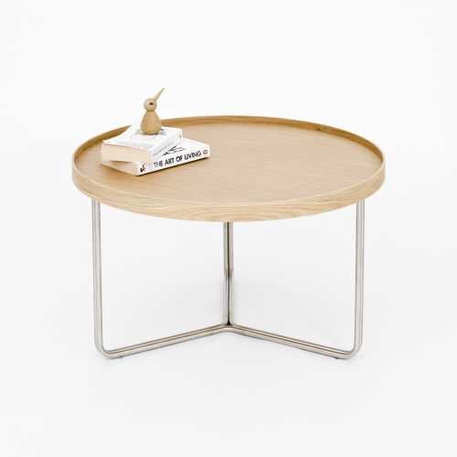 Coffee side table âDT66â is a contemporary classic design that seamlessly blends elegant natural materials with graceful, flowing lines. The round tabletop is crafted from sustainably sourced American white oak and oak veneers, selected for their warm colour, beautiful grain patterns, and traditional hardwood durability. A raised rim helps keep items secure, while the carefully hand-sanded edges and smooth surfaces offer a refined touch. Finished with a matt, stain-resistant lacquer for durability and to enhance its natural beauty. The base and legs are engineered from premium-grade 304 stainless steel, shaped for sophistication and completed with a satin brushed finish. Design by Lincoln Rivers.
