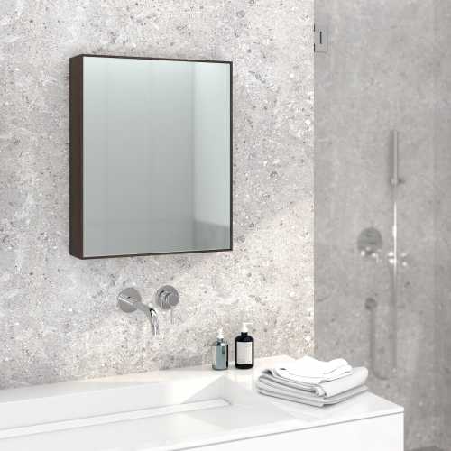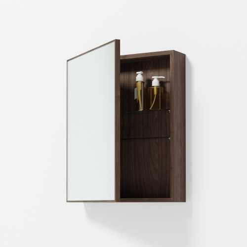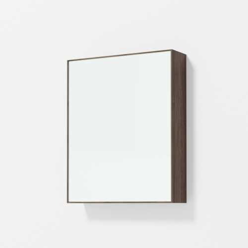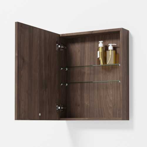 Bathroom mirror cabinet 'Slimline 550' is a minimalist, streamlined, design that fits into the tightest spots. The single mirror door gives a full face view and is framed with a solid oak beading edge. Inside it's fitted with 'soft-close' hinges for a luxury feel and there are two adjustable emerald edged glass shelves providing plenty of storage for bottles and lotions. A slim profile means the cabinet does not stick out too far from the wall. The cabinet can be mounted for either left or right hand opening. Made from sustainably harvested solid American walnut, selected for it's rich colour, beautiful grain pattern and traditional hardwood durability. Edges are carefully hand sanded and surfaces are smooth to the touch. fFnished with a matt, water resistant lacquer. Wood is a natural material and some colour variation can be expected. Design by Lincoln Rivers.